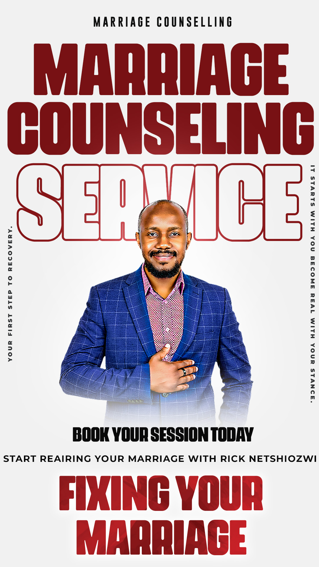 Book your marriage counselling with Rick Netshiozwi, a seasoned counselor with two decades of experience. His profound insights and compassionate guidance can help you build a stronger marriage. Counselling Bookings | 💸 Professional counselling is 2 hours per session, R 1500/$100 total. 📍 All sessions are held either online or at the church or business premises. | 🚫 Sessions are non-refundable once paid for and fully booked (Only dates are changeable)